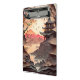 Uma bela miniprancheta marrom com uma cena de recorte de papel que mostra o antigo edifício chinês, árvores, montanhas e lago.