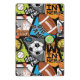 A bold, energetic sports collage featuring basketball, football, soccer, tennis, and baseball elements with dynamic typography like “Big Game,” “Goal Time,” and “Winner,” set in bright, high-contrast colors.