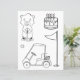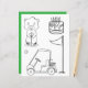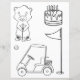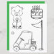 O encantador design da página de colorir apresenta um adorável gopher ao lado de um bolo de aniversário, carrinho de golfe, pino de golfe e bola. Essa design de coordenação é perfeitamente parecida com o conjunto de convites.