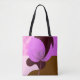 A stylish tote bag featuring a bold purple flower design with a clean and modern aesthetic.