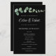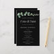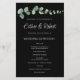 This minimalist eucalyptus black wedding is perfect to compliment a rustic wedding. The design features a beautiful calligraphy font and a green watercolor eucalyptus in a dark background.