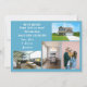 Cartão de anúncio minimalista, elegante e movente com 4 fotos personalizadas, os nomes dos membros da família e o texto "Nós nos movemos! Venha nos visitar logo!" + o novo endereço e número de telefone fixo na frente para você personalizar. Fundo azul-turquesa pálido moderno, pálido e chico, com escrevendo branco, azul e lacrimogênio.