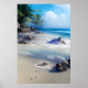 Linda ilustração aquosa de uma cena tropical nebulosa de praia com palmeiras, rochas, ondas e céus azul-turvos. Uma IA criou impressão de arte digital fantasia.