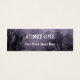 Um bilhete de evento personalizado do tamanho de cartão de visita com letras brancas verdes sobre um fundo de um céu assustador de Halloween com árvores negras ao longo de uma estrada assombrada escura, corvos góticos e uma lua de cheio nublada com uma névoa roxa. Clique em Personalizar para alterar fontes ou dimensionamento, adicionar ou remover texto, até mesmo salvar seu design para mais tarde.