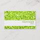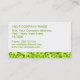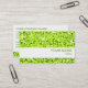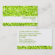 Cartão de visita com um design moderno com estrelas dispersas sobre um fundo estilizado do padrão de "aparência sequencial" em tons de verde limão, e texto verde sobre um fundo branco. Observe que esta é uma imagem de arte digital impressa, ela não brilha ou contém cinzas ou sequências reais.