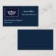 Este modelo de cartão de negócios personalizado é mostrado em uma cor azul marinho com um exemplo de texto em branco e tem um impressão de coroa paginável. Personalize e altere as informações de exemplo para as suas.