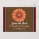 Um modelo de cartão postal de girassóis "Salve a Data". Esta é uma ilustração de um girassol em um fundo vermelho e dourado que permite personalizar a cor e o texto.