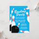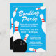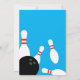 Modelo de Convite de aniversário do filho. Convites legal com bolas de boliche pretas e pinos de boliches brancas. Personalize com seu próprio nome e texto. Diversão de jogos para crianças e adultos. Fundo de cor azul ou personalizado. Vamos se diverte!