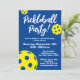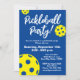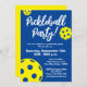 Modelo de Convite de aniversário de Pickleball. Divertido design com amigos e família. Personalize com sua própria data e texto. Bolas azuis e amarelas com o quadrado atrás. Também excelente para torneio, evento de clube, noite de partida, comemorações, reunião, CHURRASCO, dia de crianças e muito mais.