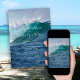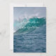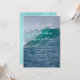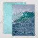 Modelo de convite de casamento na costa com imagem de fundo de grande onda do oceano. Seu texto é adicionado em três seções. O estilo de fonte impressa é usado para o texto "têm a honra de convidar sua presença" no topo, e também para o parágrafo que conterá todas as informações da cerimônia e recepção. O modelo para os nomes do casal é uma fonte moderna, manuscrita. Nomes completos ou apenas os primeiros nomes podem ser usados. Água azul profunda e topos turquesa de ondas quebrando são as cores da natureza que tornam este um convite emocionante para casais que amam o oceano. O verso é espuma azul do mar.