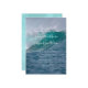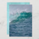 Modelo de convite de casamento na costa com imagem de fundo de grande onda do oceano. Seu texto é adicionado em três seções. O estilo de fonte impressa é usado para o texto "têm a honra de convidar sua presença" no topo, e também para o parágrafo que conterá todas as informações da cerimônia e recepção. O modelo para os nomes do casal é moderno, com letra manuscrita. Nomes completos ou apenas os primeiros podem ser usados. Água azul profunda e topos turquesa de ondas quebrando são as cores da natureza que tornam o convite emocionante para casais que amam o oceano. O verso é espuma do mar azul.