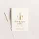 Este modelo de convite de festa com tema francês elegante apresenta um design sofisticado com uma garrafa de champanhe no centro, ladeada por duas taças de champanhe cintilantes de cada lado. A garrafa e as taças são detalhadamente sutis, evocando uma sensação de sofisticação e celebração. Abaixo deste centro de mesa, os detalhes da festa são lindamente exibidos em uma fonte francesa lúdica e estilosa, adicionando um toque autêntico ao tema geral. O modelo captura a essência do charme parisiense, tornando-o perfeito para uma soirée repleta de elegância e joie de vivre.