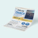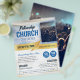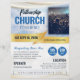 Um voador profissional atraente que é um ajustado excelente para eventos da igreja, mas é genérico o suficiente para ser para qualquer evento ou conferência. A parte superior tem um fundo do céu desvanecido, com toques dourados e fitas por todo o lado, e uma imagem quadrada editável no fundo da imagem da frente e do cheio no verso. Todas as informações são editáveis no folheto, incluindo as informações do tíquete nos círculos. As cores da fonte podem ser alteradas no Editor.