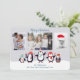 Três das suas fotografias familiares favoritas tomam o palco central neste Cartões de foto de Natal giro que é especialmente apropriado para uma família jovem. Na base está uma adorável família de pinguins celebrando os feriados à sua maneira. Seu texto personalizado em azul está no topo e no fundo. A parte traseira da placa está em azul médio.