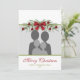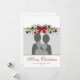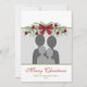 Design de foto festiva de Natal com a ilustração original de Destei de uma terra de pinheiro verde que é decorada com um grande arco vermelho e alguns baubles de Natal vermelhos. Há também duas áreas de texto personalizáveis.