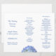 Programa de casamento triplo em branco com texto azul e um desenho de flor de hortênsia azul. Dobre em terços após a compra para criar três páginas com título, nomes, data e local do serviço na frente. A seção do meio contém as informações da cerimônia com o lado direito para listar a festa de casamento, nota pessoal para os convidados, em memória de, ou o que você desejar. Uma imagem de hortênsia azul claro está na parte inferior da seção do meio.