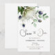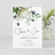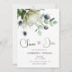 Este belo cartão Save The Date apresenta uma pintura em aquarela de protea e flores de cardo com ramos de eucalipto. As cores são suaves e discretas, dando ao cartão um sentimento elegante e romântico. As palavras “Save The Date” são escritas em uma fonte de letra cursiva linda que complementa a pintura em aquarela. Os nomes do casal, data e local do casamento também estão incluídos em uma fonte simples, porém elegante