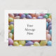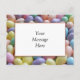 Um fim acima do pastel coloriu feijões de geléia no fundo e uma caixa branca com uma beira coral espera sua mensagem pessoal