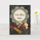 Photoframe do olhar do vintage para seus cumprimentos do dia de Mother´s: Um carvão vegetal textured o fundo, um quadro redondo do laço do crochet para sua foto. Tudo decorado com uma fita vermelha, uns flowrs secados, e um hangtag do metal que diz "para a mamã".