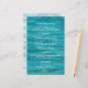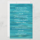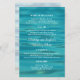 O cardápio de casamento com fundo de praia oceânica. As ondulações de água são o pano de fundo do texto branco e personalizado. Os nomes da noiva e do noivo estão no centro do jornal. Personalize quatro seções com informações do menu.
