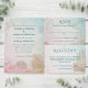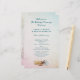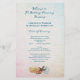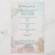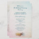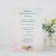 Programa de casamento em mar vivo impresso em papel de barato. Personalize o texto em ambos os lados sobre um fundo gradiente com conchas na frente e mais vida marinha no verso. O texto é cor azul-do-mar profundo e alterna entre o script e as fontes impressas. O espaço é dado no verso para uma pequena mensagem do casal. O tamanho do papel é 5,5 x 8,5.