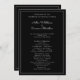Modelo de programa de casamento preto simples com texto branco em ambos os lados de cartões planos. O design de amostra tamanho 5x7 ajustado em alguns outros tamanhos. Essas placas também têm upgrades opcionais de papel. O texto impresso e as fontes de script manuscritas são fáceis de personalizar usando as seções modelo. Um conjunto fino de linhas faz uma borda ao redor da borda das placas para enquadrar o texto. Personalize o título do programa, inclua a data e a hora do evento, a ordem da cerimônia e liste a festa de casamento. Um modelo no verso pode ser usado pelo casal para escrever uma mensagem pessoal para os convidados. Ou use o espaço para mencionar parentes que não estão mais vivos, mas presentes em corações. Este simples design de programa que funciona para muitos tipos de cerimônias de casamento.