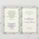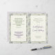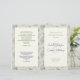 O programa de casamento dobrado com o desenho floral e a longa cerimônia da igreja modelo. As flores de hydrangea multicoloridas com folhas fazem um padrão de fundo de um lado. Quando dobradas, essas páginas serão a frente e o verso do programa. As cores são verdes claras e lavandas. O script moderno é usado em roxo para os nomes dos casais sobre um grande e grande computador. No verso do jornal estão incluídas as informações da cerimônia à esquerda e a lista de participantes à direita. Todo o texto é um exemplo e não uma verdadeira ordem de cerimônia! Altere o texto conforme necessário e adicione/remova o espaçamento ao texto do ajustado. Se sua cerimônia será muito mais simples, talvez faça o texto um pouco maior, ou como eu para ajudar.