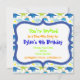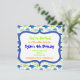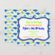 Modelos de Convite de aniversário de Dinossauro Gelado com cores azuis, verdes limões e laranja. O texto do convite está rodeado de um quadro azul. Uma festa pré-histórica bonita convidada para os aniversários de meninos e meninas.