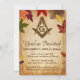 Aqui estão alguns modelos de convite masônico sobre o tema único do outono para sua instalação anual de oficiais ou outra cerimônia/evento de hospedagem (incluindo Ação de Graças). Projetado com um quadrado de "queimado" e símbolo de compasso de freemasonry, este modelo de convite de outono, personalizado, rústico, tem um antigo e antigo visual com o pano de fundo texturizado de papel pergaminho vestido. Folhas de outono de várias cores estão espalhadas na frente e no verso deste convite que você pode personalizar para completar a "aparência de outono". Categoria: convites masônicos russos; guia de modelo de convites freemason personalizado; convites masônicos de ação de graças. Cores: cores de queda, tons de terra, pergaminho, marrom, ouro e preto.