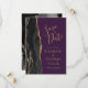 A borda esquerda deste elegante casamento moderno salve o cartão de data apresenta uma borda de agata preta aparada com falso brilho dourado. O texto personalizável combina manuscrito dourado, fontes em copperplate e itálico em um fundo roxo. O verso apresenta um design de agate preto e dourado correspondente.