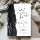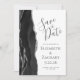 A borda esquerda deste elegante casamento moderno salve o cartão de data apresenta uma coloração d'água preta aparada com falso brilho prateado. O texto personalizável combina a escrita manual de cinzas de carvão, as fontes em copperplate e itálico em um fundo branco. O reverso é sólido fora do preto.