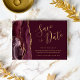 Este elegante e moderno salve o cartão de data apresenta uma borda de cor d'água borrifada, aparada com falso brilho dourado. O texto personalizável combina um guião de escrita manuscrita dourada, fontes em copperplate e itálico num fundo burgundy. O lado inverso apresenta uma burgundy e uma design de agata dourada.