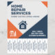 A professional home repair services flyer with tear-off tabs with a clean, modern design featuring bold blue and orange accents, accompanied by a house-shaped icon, all on a gray background with subtle geometric patterns.