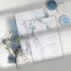Um fundo de abstrato que lembra o mármore brilhante em tons de azul empoeirado através do azul e do branco de aço é o pano de fundo para textos elegantes e layouts modernos de design nos pedaços desta bela suíte de casamento. O convite mostrado aqui contém um texto alinhado à direita com uma borda de mármore elegante. Procure ID816 para ver outras peças e opções de cores para este conjunto.
