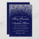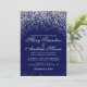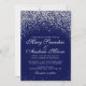 Um convite elegante com um confete de brilho prateado se dispersando em um fundo azul real profundo. A parte traseira da placa apresenta um pequeno aglomerado de brilho prateado no centro. Você pode personalizá-lo completamente indo para o menu personalizar. Isto é parte de uma bela suíte de casamento.