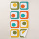 Este conjunto de toalhas tem um pano de lavagem de tartaruga, uma toalha de mão verde, e uma toalha de banho com um design moderno do século médio de quatro retângulos arredondados em quatro filas com ovais dentro em laranja, amarelo, verde e turquesa.