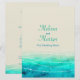 Belo mar verde-azul pintado com ondas gráficas no menu de janto de casamento da camada de ondas brilhantes. Uma bela praia, oceano costeiro inspirado, contemporâneo, cardápio de casamento com um único e estilizado mar de aquarela manual, em um papel a cores de areia. Perfeito para um casamento de praia moderno. Edite este menu de jantar com suas próprias palavras. Único projetado e pintado por Sarah Trett.