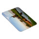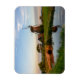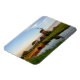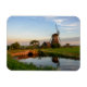 Imagem retangular de souvenir com um moinho de vento próximo a uma pequena vala com uma ponte na borda de um grande campo no campo holandês ao pôr do sol em Aarlanderveen, Países Baixos.