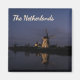 Fotografia de Souvenir com moinhos de vento iluminados e históricos, com reflexo na água do rio durante a Hora Azul, no início da noite, em Kinderdijk, nos Países Baixos, com o texto: "Países Baixos".