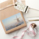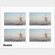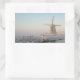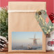 Etiqueta retangular com um moinho de vento holandês tradicional coberto na neve em uma paisagem rural em Aarlanderveen, os Países Baixos, no inverno na luz morna do amanhecer no nascer do sol. Uma grande lembrança!
