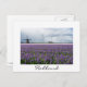 Cartão postal de uma paisagem com moinho de vento tradicional e várias moinhos de vento modernos para gerar energia verde atrás de um campo com flor de hífen roxa na região de Bulb, na Holanda, com uma fronteira branca e o texto: "Holanda".