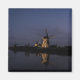Fotoímã de Souvenir com moinhos de vento iluminados e históricos, com reflexo na água do rio durante a Hora Azul no início da noite em Kinderdijk, nos Países Baixos.