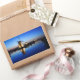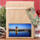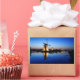 Vinheta-foto retangular de moinhos de vento históricos iluminados ao anoitecer durante a Hora Azul com reflexo na água numa paisagem em Kinderdijk, Países Baixos.