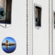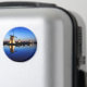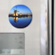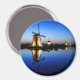 Imagem fotográfica redonda de souvenir de moinhos de vento históricos iluminados ao anoitecer durante a Hora Azul com reflexo na água numa paisagem em Kinderdijk, Países Baixos.