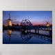 Poster de dois moinhos de vento iluminados e uma ponte de tração com reflexo na água do canal na última luz do pôr do sol em Kinderdijk, nos Países Baixos.