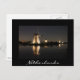 Cartão-postal de uma paisagem com várias moinhos de vento, iluminados à noite, com reflexo na água do canal, em Kinderdijk, Países Baixos, com uma fronteira negra, e o texto: "Países Baixos".