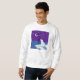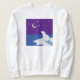 Um filhote de urso polar ártico branco com os olhos azuis brilhantes que sentam-se na neve que olha acima na lua e nas estrelas crescentes no profundo - céu roxo do nighttime sobre águas geladas azuis. Arte animal original por Alicia Marie.