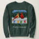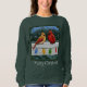 Os Cardinais Vermelhos nortes tocam uma cerca branca pendurada com luzes de Natal. Os flocos de neve caem do céu noturno, cobrindo a floresta ao redor com um cobertor de inverno de branco.