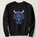 Legal camisola de dragão azul com ilustração digital da cabeça desta legal criatura mágica com chifres em cores roxa e azul sobre fundo azul escuro.