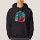 Uma mulher com cabelos vermelhos fluindo monta um foguete vermelho brilhante em forma de coração rodeado por nuvens lisas num céu azul claro. O texto diz: Cuidado com o bombardeio do amor!